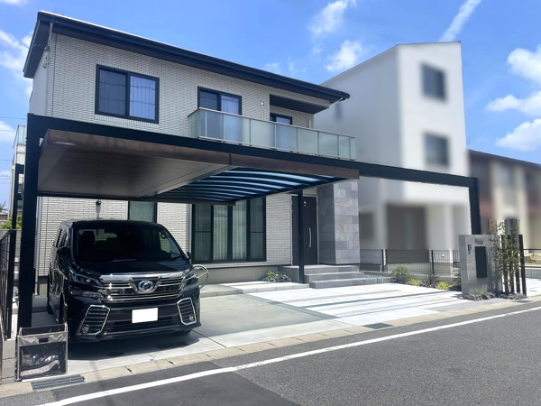 梁延長仕様のカーポートで、玄関付近のタイル貼りの存在感を残しつつ、アプローチ付近もかっこよく(もともとカーポートはあまり考えていなかったようですが、提案したら気に入っていただけました)
