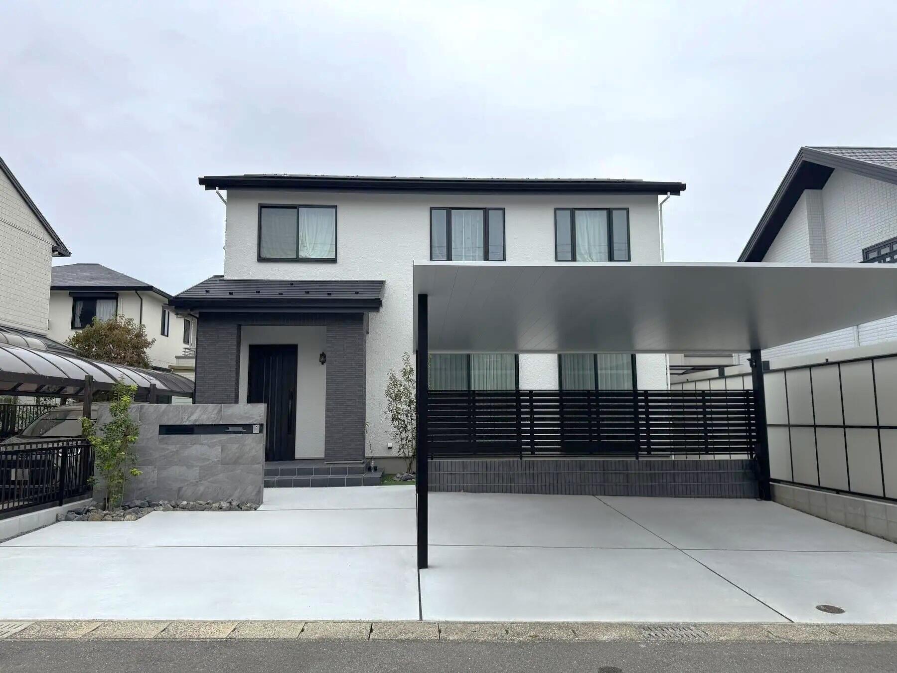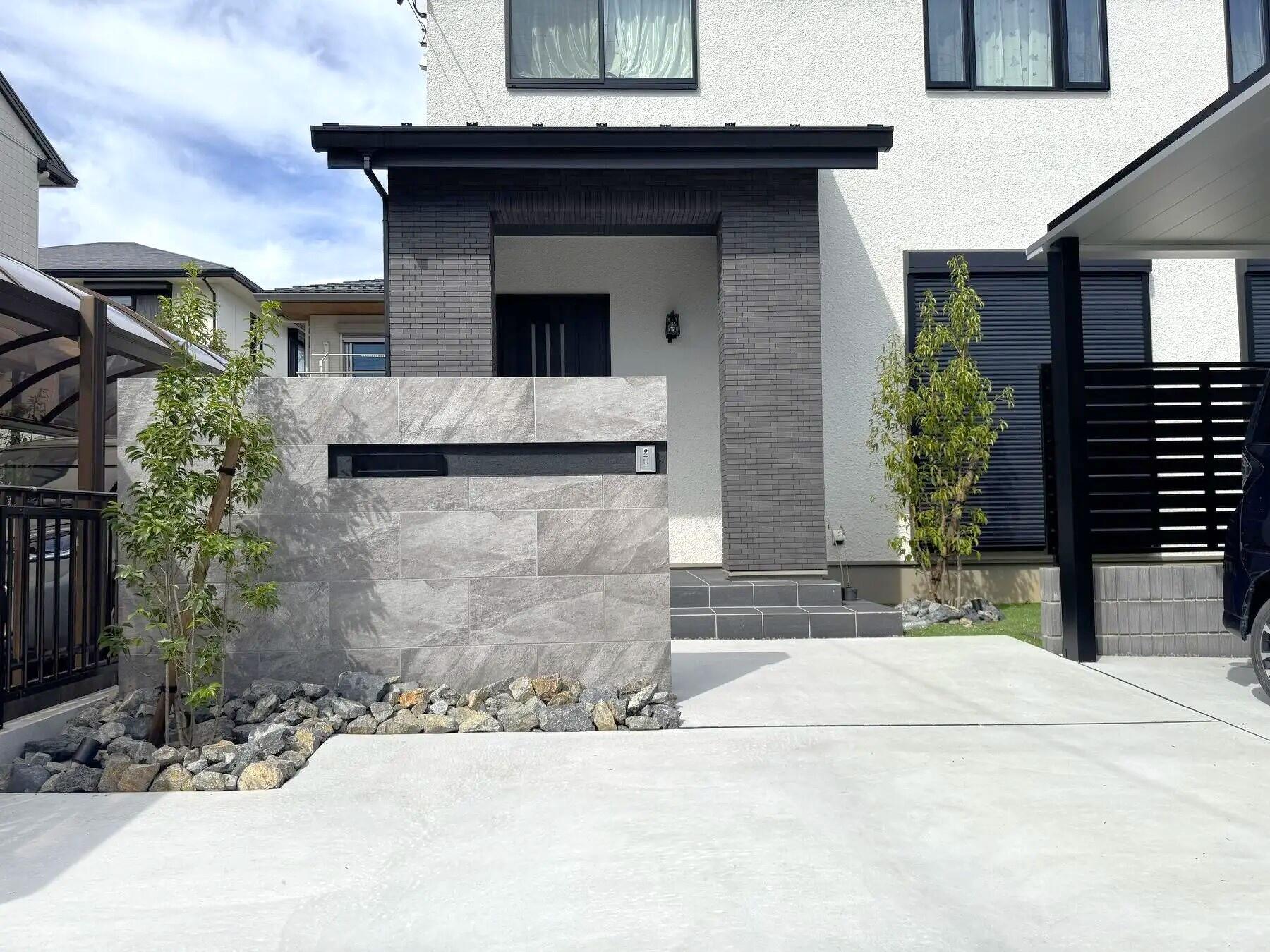 タイルの門塀、アルミ屋根の2台用カーポート、なるべく手入れのいらないお庭にしたいとのご希望がありました