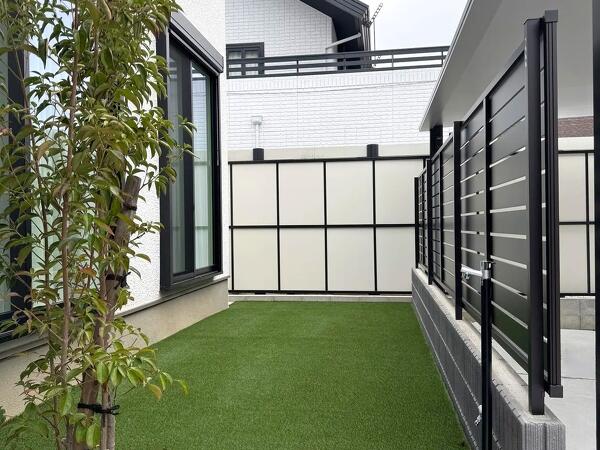 庭は人工芝にすることでほぼ手入れは不要です。シンプルなレイアウトの中のアクセントという役割で、門廻り、玄関廻りに植栽を提案しました