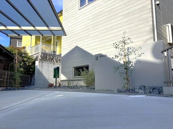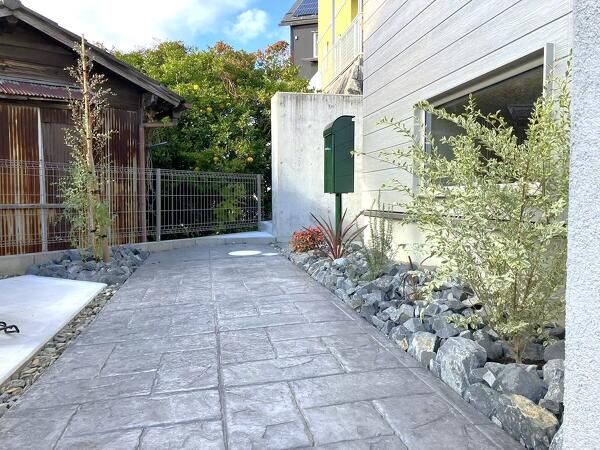 植栽が彩る我が家の顔 ジョリパット門柱とユーカリポポラス <お客様のご要望> ドライガーデンを作りたい。 カーポートが欲しい 異形地だけど機能的にしたい <弊社からの提案と特徴・こだわり> ブロック門柱位置は、車が停まっている状態でも誰の家か分かるように表札が見える場所にしたのと、裏側の室外機を隠す要素も用いりました。単独ポストにしたのは、玄関からの取り出しを機能的にするため。 ご主人様ご要望のドライガーデンを作り、それに相応しいスタンプコンクリートを添えました。 <お客様からの反応・声> 非常に満足しています。 ドライガーデンを施工する際は、庭師さんと相談しながら納得いくかたちにできてよかったです。 <主な使用商材> ・三協アルミ スカイリード ・表札 オンリーワン ニューヨークスタイル ・ポスト オンリーワン フィールⅡ ・立水栓 ベベル 門・アプローチ廻り 車庫廻り 新築外構 オープンスタイル コンクリート舗装 カラー舗装 植栽 カーポート 施工地:長久手市 事例ID : 事例ID:23_00
