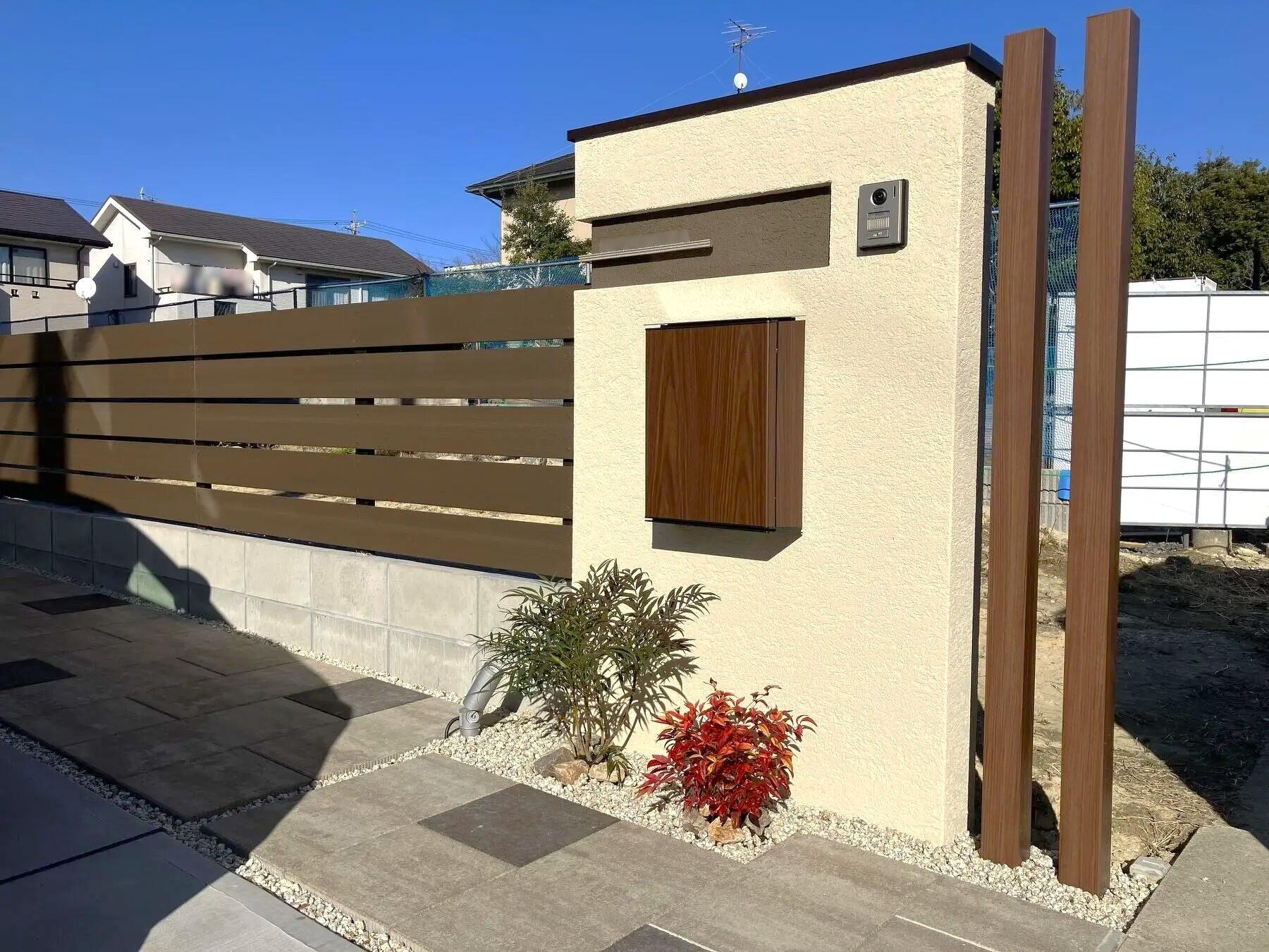 外壁とマッチ。塗装壁門柱の外構。 <お客様のご要望> 駐車スペースを3台確保しつつ、建物の雰囲気にマッチした外構にしたい 正面の掃き出し窓前に目隠しがほしい <弊社からの提案と特徴・こだわり> 外壁の塗装仕上げに合わせて、門柱も塗装にした ベージュ系をベースにして、ブラウン系の色味をアクセントにした <お客様からの反応・声> イメージ通りの外構になり大変満足していますとお喜びのお声をいただけました <主な使用商材> ・B-Life.s ニコボード ・LIXIL プラスG Gスクリーン ・ユニソン リビオaiプラス ・ジョリパット塗装 庭廻り アルミ スクリーンフェンス テラス屋根 木樹脂デッキ 施工地:名古屋市千種区 事例ID : 事例ID:22_00